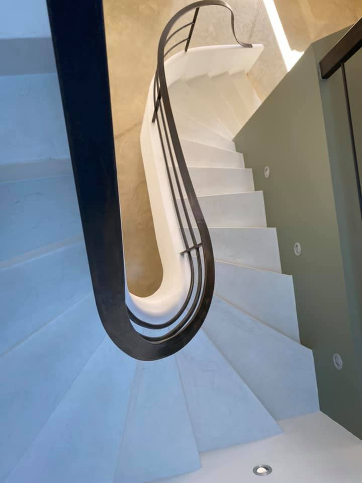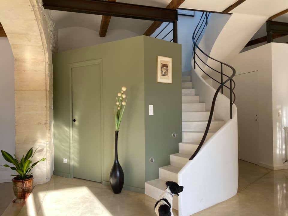 C’est ce qui est retranscrit dans les courbes de notre escalier sur voûte sarrasine avec son limon en staff (technique ancienne ) et son revêtement en béton ciré (finition contemporaine),