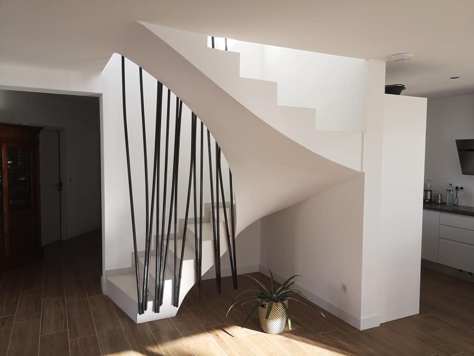 Le garde corps est en fer forgé imitant des roseaux … les marches et la plinthe sont en béton ciré, confèrent à l’escalier légèreté et courbes épurées.