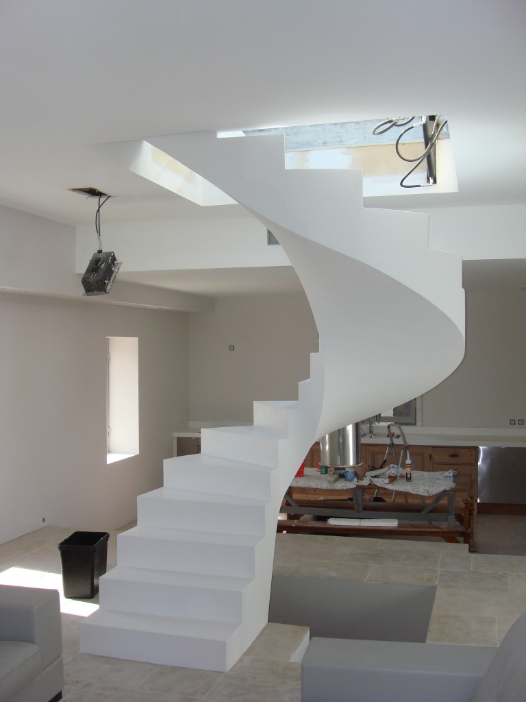 L’escalier est entièrement en brique et plâtre. Même le revêtement des marches est en plâtre. Plâtre complété d’un adjuvant afin de lui conférer une plus grande résistance mécanique, capable de résister aux frottements des chaussures. Une belle prouesse technique réalisée au début de la création de notre entreprise… le temps, la pratique, l’expérience, nous permettront de pousser plus loin encore notre savoir-faire.