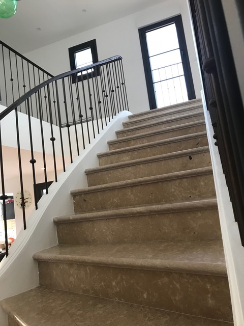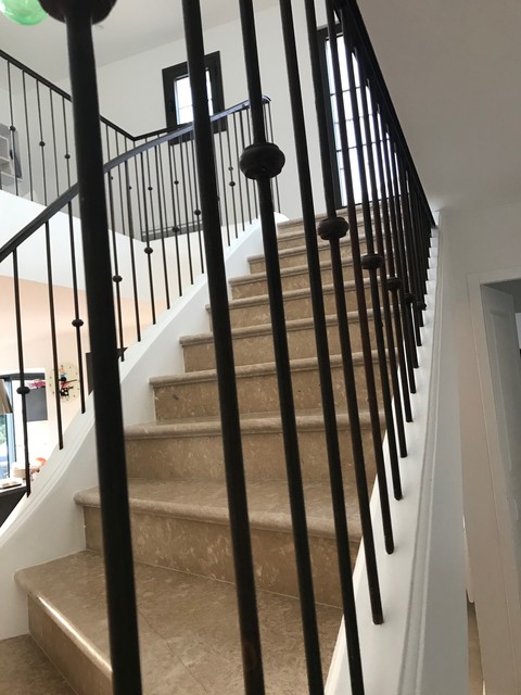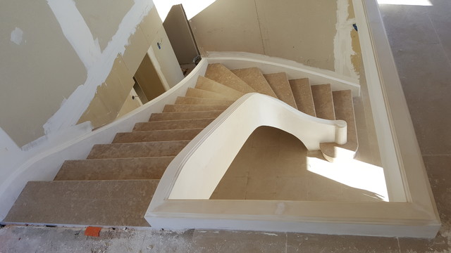 Escalier sur voute sarrasine de style 19e siécle se place au milieu d’un salon contemporain …